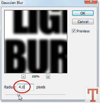 به Filter>Blur>Gaussian Blur برین و این فیلتر رو با تنظیمات زیر روی نوشته اعمال کنید.
